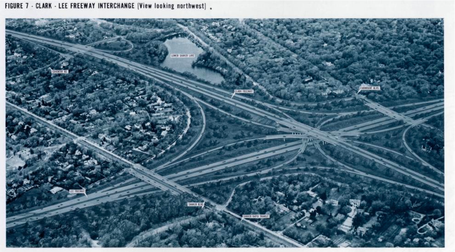 This artist's rendering shows the 1960s proposal for a highway interchange just east of Lower Shaker Lake. The Clark and Lee Freeways would have intersected where the Nature Center of Shaker Lakes is now located. Lower Shaker Lake would have remained mainly intact, but with the Clark Freeway running alongside its entire southern shore. | Source: Cleveland State University Library Special CollectionsDownload Original File