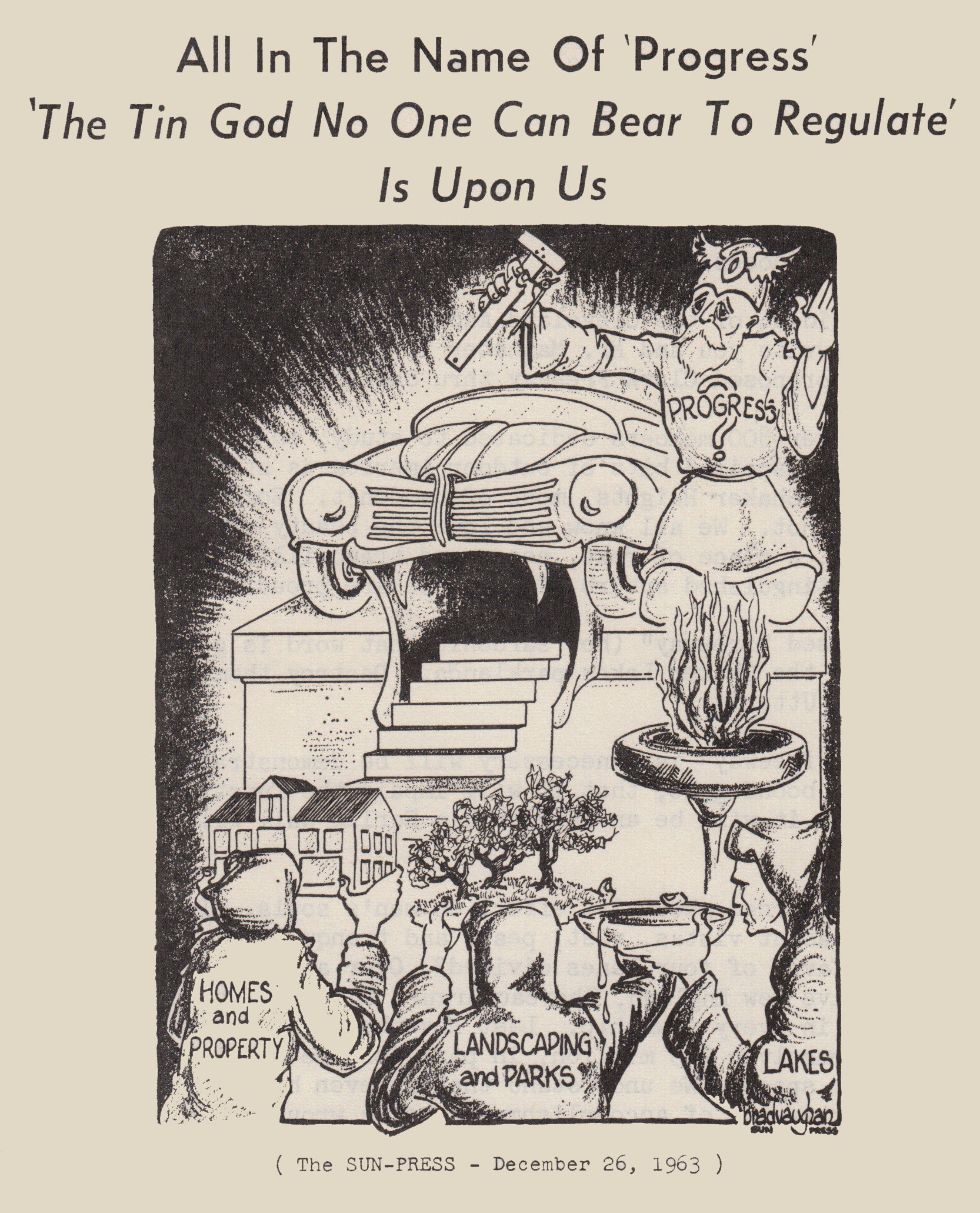 This editorial cartoon appeared in the Sun Press on December 26, 1963 in response to a proposal by the Cuyahoga County Engineer's Office to build freeways through Shaker and Cleveland Heights. The Clark and Lee Freeways would have met at an interchange near where the Nature Center of Shaker Lakes sits today. Horseshoe Lake would have probably been destroyed had the plan proceeded, but a series of protests by local residents (including the founding of the Nature Center in 1966) ultimately prevented the freeways from being built. | Date: 1963 | Source: Shaker Historical SocietyDownload Original File
