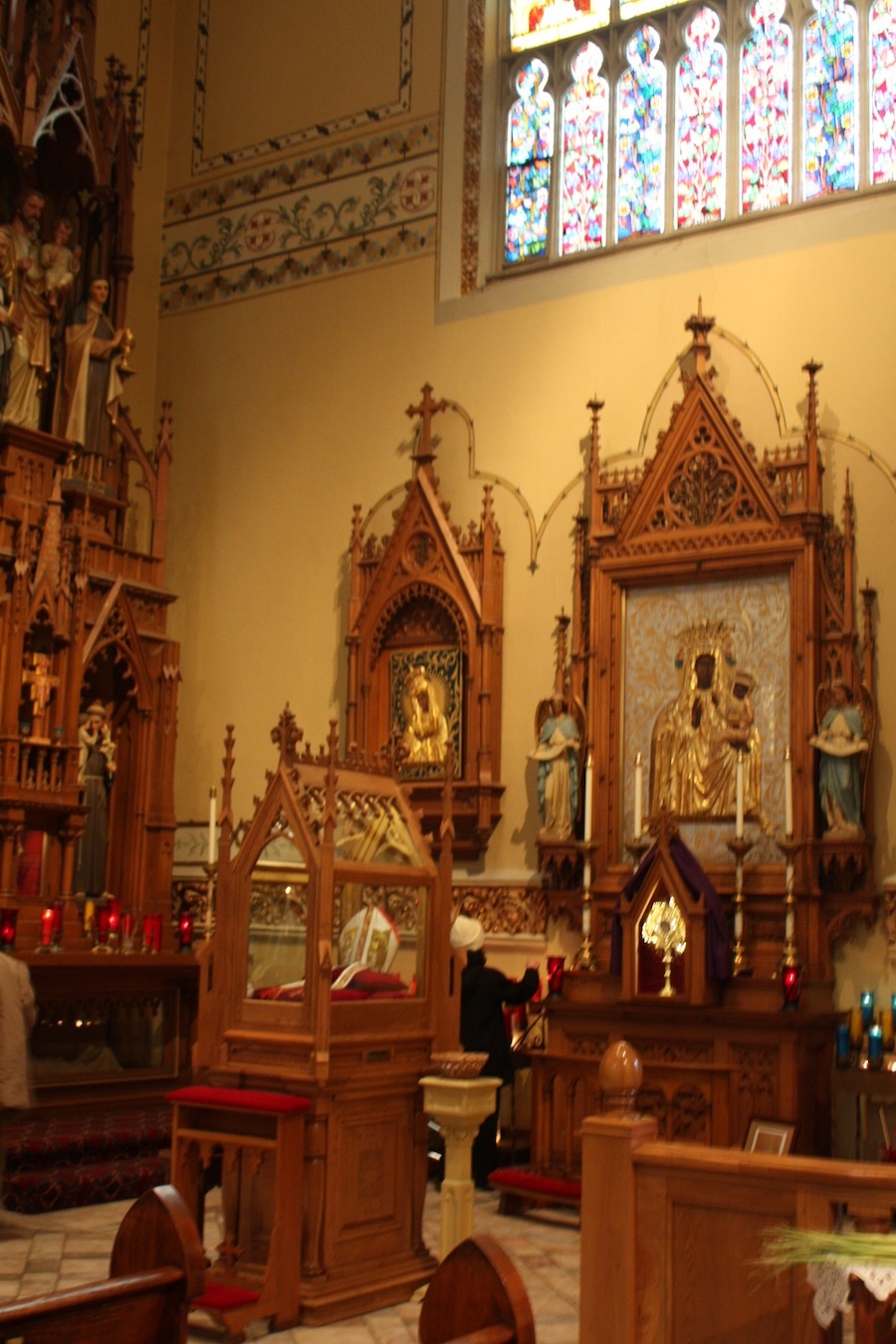 During a visit in 1969, Cardinal Karol Wojtyla (later Pope John Paul II), the bishop of Krakow presented relics of St. Stanislaus to the congregation in Cleveland. He thanked them for their continued support of Poland during and after World War II. The pope's mitre is encased in the foreground of this photograph. | Creator: CSU Center for Public History + Digital HumanitiesDownload Original File