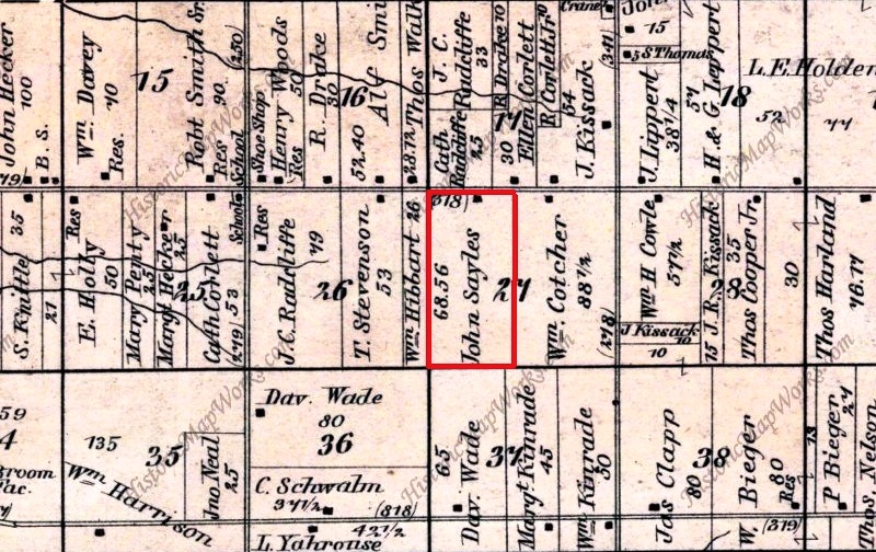 This 1874 map of Warrensville Township reveals the location (shown by the red outline) of John Sayle's nineteenth century farm in the township. Note that the map's author identified the owner's name and the number of acres of land for each parcel shown on the map. The small black square dot within the red outlined area of the Sayle Farm is the approximate location of the John Sayle Home on what was then North Woodland Road. Sayle's 68.5 acre farm comprised almost half of original Warrensville Township Lot 27.