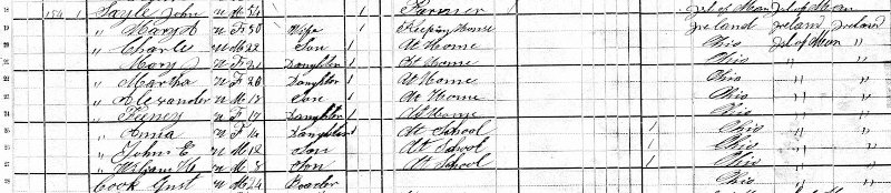 This section of a page from the 1880 federal census reveals important data about John Sayle and the members of his family. He and his wife are both shown as immigrants, and John's occupation is farmer. It is also notable that all of the couple's children under the age of 17 were attending school in 1880. This is consistent with historians' understanding of the value that nineteenth century working class Ohioans placed upon a public education for their children.