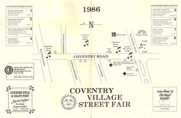 This map not only shows where entertainment took place during the Coventry Street Fair, but also how Coventry has changed in in the last twenty-six years. Trapezoid and High Tide/Rock Bottom are no longer in the three block district, while businesses like Passport to Peru and The Inn on Coventry are still a part of Coventry Village. | Source: City of Cleveland HeightsDownload Original File