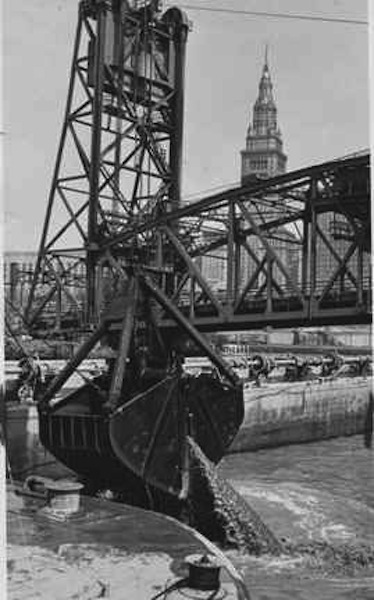 The U.S. Army Corps of Engineers was contracted by the Cleveland Port Authority to dredge the Cuyahoga river to maintain shipping clearance. Annual dredging has helped keep the river open to large ships for over a century. | Source: Cleveland Memory Project, Cleveland State University Library Special CollectionsDownload Original File