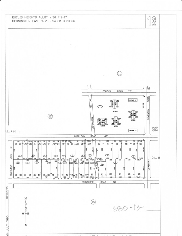 This original diagram submitted for study by developers Jerry F. Weiss and Dr. Nils Carlson in 1964 shows the plan to build four four-unit structures and two garages. The cruciform layout of the actual buildings turned out to be very similar to what is depicted in the drawing. | Source: City of Cleveland HeightsDownload Original File
