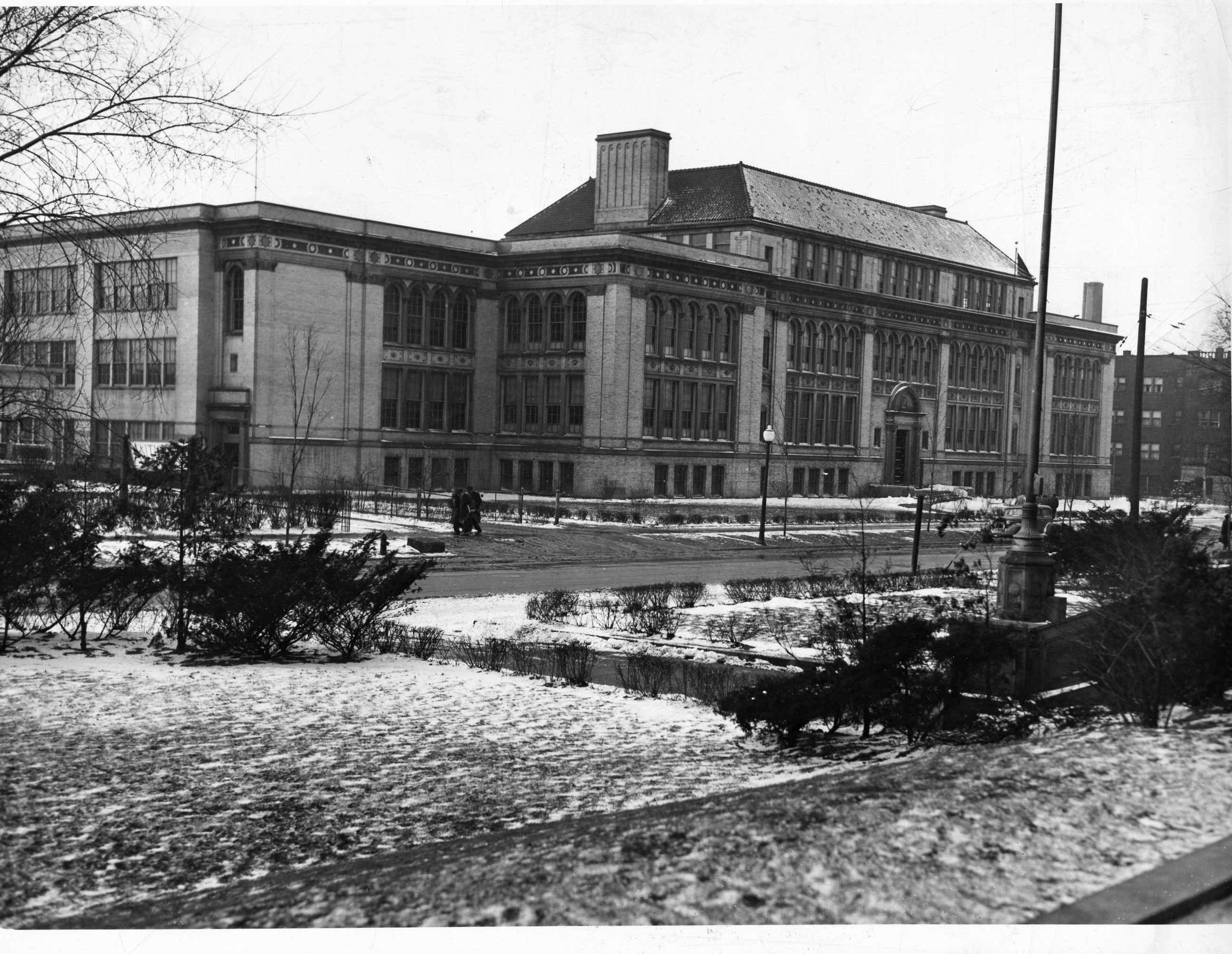 The original building and the annex that was added in 1931 are here seen from across East 107th Street. This photograph was most likely taken from the lawn of John Hay High School. | Source: Cleveland Memory Project, Cleveland State University Library Special CollectionsDownload Original File