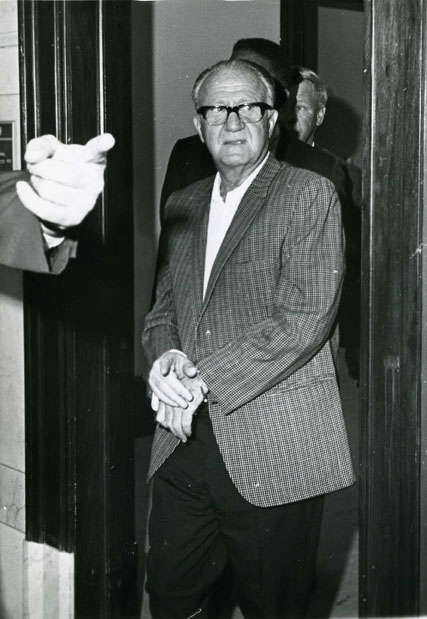 An elderly Shondor Birns leaves a Cleveland courtroom. | Date: ca. 1970s | Source: Cleveland Memory Project, Cleveland State University Library Special CollectionsDownload Original File