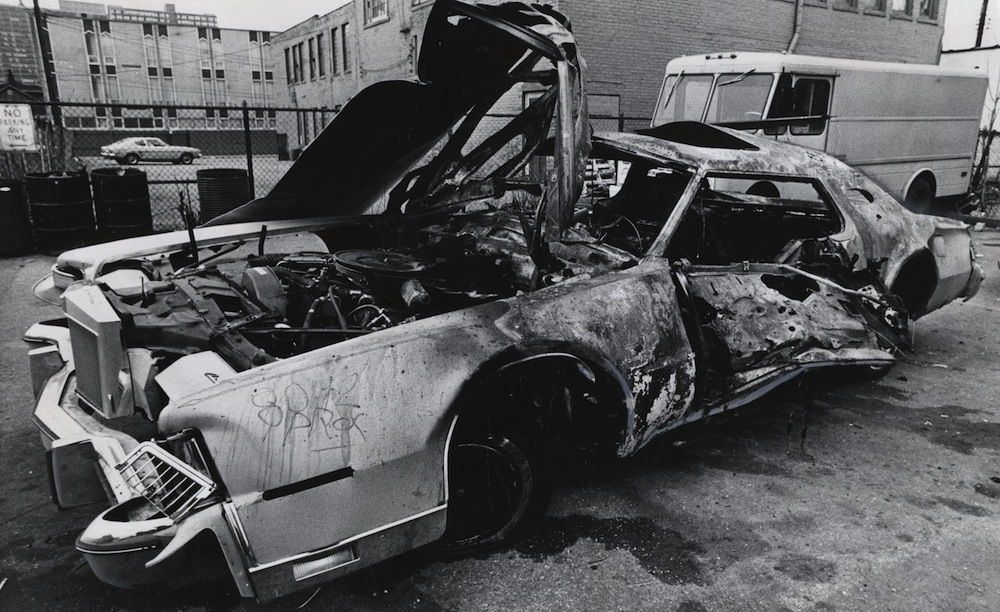 The wreckage of Shondor Birns' Lincoln Continental Mark IV outside of Christy's Lounge at 2516 Detroit Avenue in March, 1975. While no one was ever tried for the murder of Birns, it was widely believed that Danny Greene was responsible for the bombing. The two feuded over an unpaid debt to the Gambino family for which Birns held Greene responsible. | Date: 1975 | Source: Cleveland Memory Project, Cleveland State University Library Special CollectionsDownload Original File