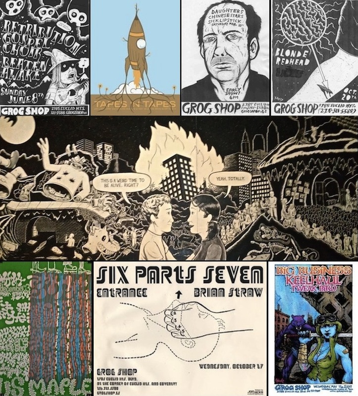 Photographed above (center row) is a scene from a wall mural by Jake Kelly, located on the south wall of the Grog Shop. Flier artists represented include Tyler Fortney, John Greiner, Jon Hicks, Seri Pop and Jake Kelly. | Source: Grog ShopDownload Original File