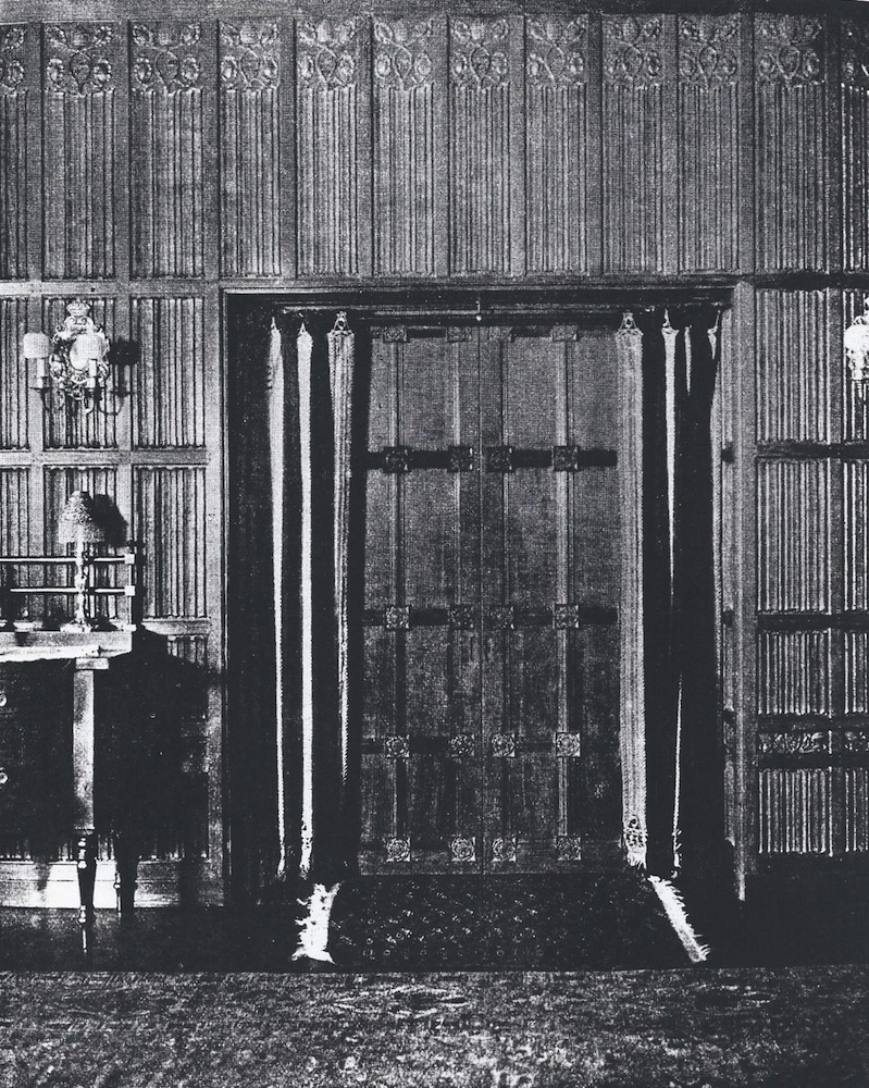 "Perhaps the most interesting room in the house is the dining room, with its linen fold paneling, ornamental plaster ceiling and great carved limestone mantel. The woodwork is of English oak... The linen fold paneling is carried to the ceiling and ... the carving is excellent in character, of low relief, and has the texture which is so beautiful in the old hand wrought work." | Source: I. T. Frary, "The Rebuilding of Longwood," The Architectural Record, June 1917, 500, Google Books.Download Original File