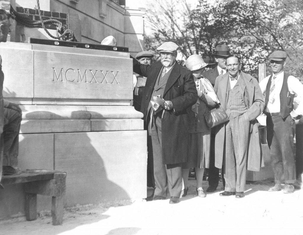 John L. Severance (one the left, wearing a hat) poses during the construction of Severance Hall in University Circle. Severance donated more than $2.5 million for the construction of the Cleveland Orchestra's new home. | Source: Cleveland State University Library Special CollectionsDownload Original File