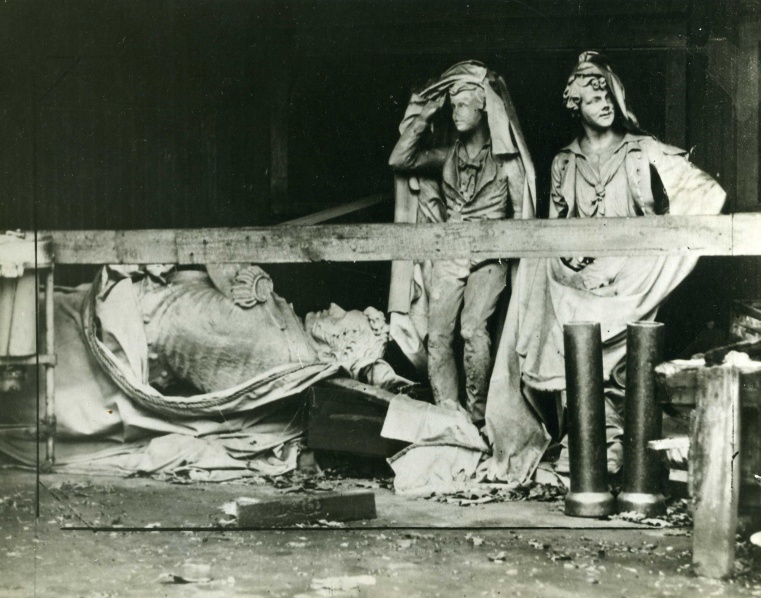This image shows the original statue stored in a shed at Gordon Park awaiting its next home. Many organizations declined to take the statue and here it sat until it was given to Perrysburg, OH. Another bronze replica was made for Perrysburg as the original marble statue continued to deteriorate. It is currently on loan to the National Park Service's Visitor's Center at Perry's Victory Memorial near Put-In-Bay.