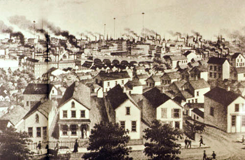 If you look closely at this drawing - a view from Cleveland's west side - you can see the 150-foot tall masts which towered over the city, holding the Brush Arc Lamps which lit up Public Square. Just one year prior in 1879, Brush's electrical street-lighting system was unveiled in Public Square. | Date: 1880 | Source: Cleveland State University Michael Schwartz Library Special CollectionsDownload Original File