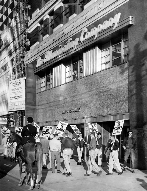 This May 1, 1957 picket line on Public Square in front of the 75 Building, and incomplete 55 Building, is visual evidence of the longest strike in C.E.I.'s history. The strike lasted from April 24 to May 7, 1957.