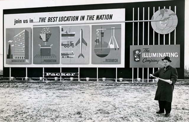 This sign promoting C.E.I.'s most infamous slogan was erected opposite the highway entrance to Cleveland Hopkins Airport in January 1962. At the time such dimensions, measuring 80 feet long and 32 feet high, made the sign one of the largest such displays in the country. Karl H. Rudolph, the marketing vice president of C.E.I. at the time, stands proudly nearby.