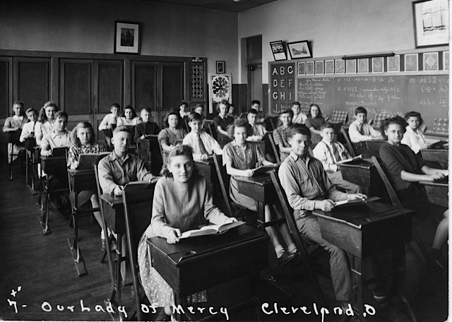 This photo shows a seventh grade class at Our Lady of Mercy school in the 1940s. In September 1964, nearby St. Augustine school merged with Our Lady of Mercy. Classes continued at Our Lady of Mercy until June 1973 when the school closed. | Source: Slovak Institute of ClevelandDownload Original File