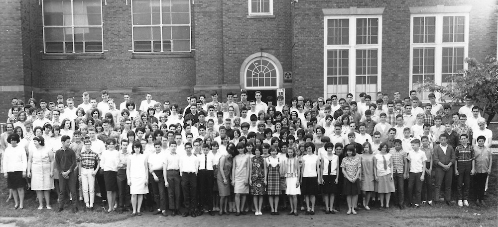 While the front of the building was used for group photos, class photos were often taken behind it. The tremendous number of students from the baby boom and constant use of the buildings would leave Monticello and other schools in need of significant work by the 1970s. In the 1980s much of the aesthetic and design concepts behind the 1970s renovation program would be called into question, with the lost architectural details mourned. | Source: Cleveland Heights High School Alumni FoundationDownload Original File