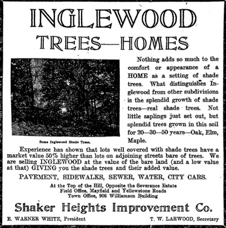 This early advertisement by the Shaker Heights Improvement Company, which also subdivided other sections of Cleveland Heights, extols the virtues of Inglewood. Note that this pitch focuses both on natural amenities and manmade improvements, bringing city conveniences to the scenic borderlands popularized by the likes of the Severances with their country villas in the Heights.