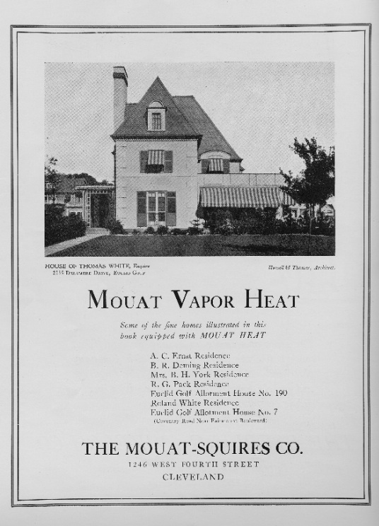The Mouat-Squires Company was one of several companies that mentioned the homes of prominent people, such as A.C Ernst, to promote their products. The home shown here in the B. R. Deming Co.'s brochure The Home in Good Taste is 2335 Delamere Drive in Euclid Golf, although it looks quite different today because of a prominent addition constructed in the 1920s. Also mentioned in the ad is the B. R. Deming House at 2514 Fairmount Boulevard.