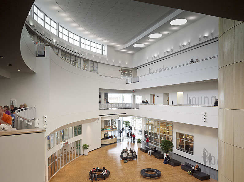 This view of the interior of the Student Center was taken from the second floor and shows the main lobby of the Center soon after the facility opened. The extreme minimalism prompted the university to add large, colorful banners and encourage student organizations to hang their own banners and signs. Very seldom would one find the building so empty. Indeed, it has become a hive of activity day and night.