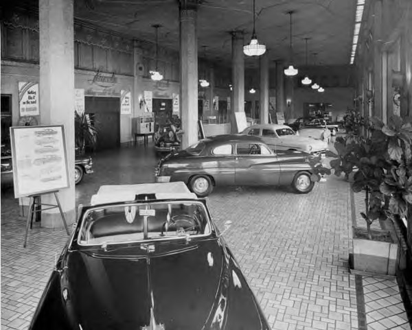The Ohio Motors Co. building contained a showroom which displayed some of the finest automobiles sold to the Cleveland public from the 1930s until the 1950s. After Fenn College acquired the building in 1956, the building's showroom was converted into a student lounge, known as the Foxes Den Lounge--after the Fenn College mascot. It retains that name to this day, even those Cleveland State University's mascot is a Viking. | Date: 1951 | Source: Cleveland Memory, Cleveland State University Library Special CollectionsDownload Original File
