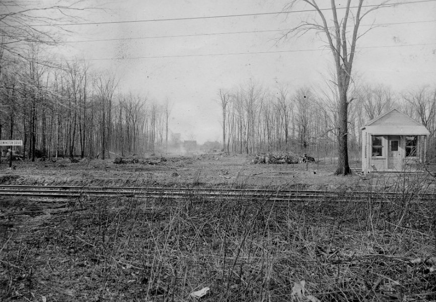 Barton Deming laid out his namesake, Demington Drive, running from the north to the south entrance of the development, with substantial lots on either side. The site was heavily wooded. Looking north from the streetcar tracks in this winter view, one can see three large estates on Cedar Road. The building in the right foreground was likely a small shelter in which riders, possibly having walked down a path from Cedar, could wait for the trolley. | Date: 1913 | Source: Hugh and Deanna FisherDownload Original File