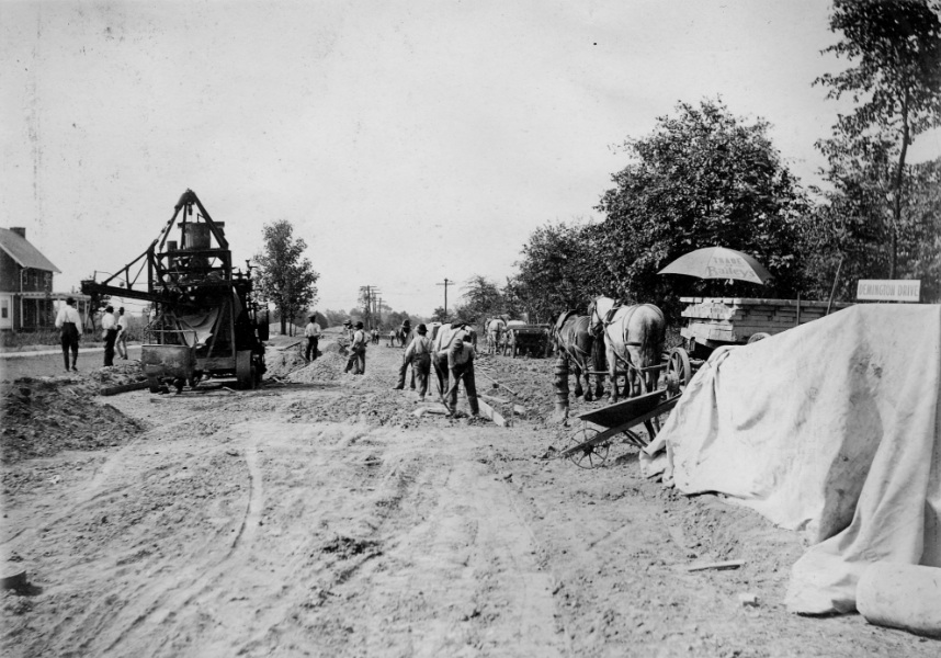 Street construction at the time of Euclid Golf's development involved a combination of man power, horse power and steam power. Deming built the southern portion of Demington Drive, from Fairmount Boulevard to West St. James Parkway, in June 1914. The house to the left is 2357 Demington Drive, the first house constructed by the B. R. Deming Company. It was built in early 1914, before the road was put in. Designed by Howell & Thomas, original drawings show the house to be rare for Euclid Golf in several respects. First, it had a full length front porch and, second, it has since lost this lovely feature. Few Euclid Golf houses have front porches and most retain all of their original design elements. | Date: 1914 | Source: Hugh and Deanna FisherDownload Original File