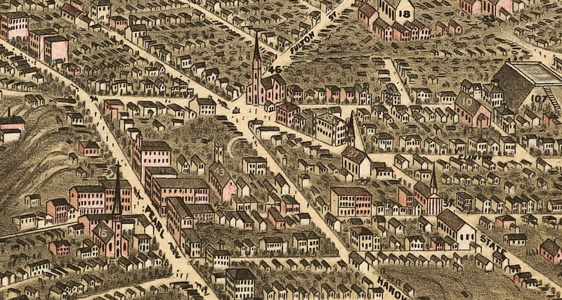 This part of artist A. Ruger's "Birds Eye View of Cleveland Ohio - 1877" shows with amazing detail the street plan and housing of the Franklin Circle neighborhood in 1877. The church with the tall spire--numbered by the artist with the numeral "46" and seen on the southwest side of the Circle, is Franklin Circle Christian Church. The large man-made structure on the right side of the drawing several blocks west of the Circle (and numbered "107") is the Kentucky Street Reservoir, a critical component of Cleveland's early waterworks system.