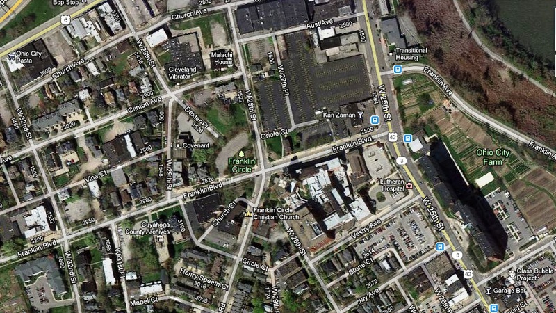 This recent Google map satellite photo shows that over the course of the last 175 years, Franklin Circle has become something less than a circle. Institutional and multifamily residential buildings have intruded on several quadrants of the Circle, and the pattern of the roads as originally designed to radiate from the Circle has also significantly been altered.