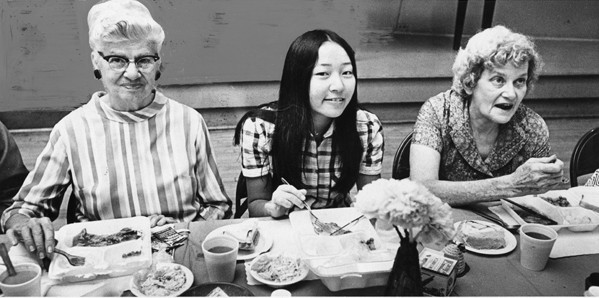 Franklin Circle Christian Church has a long history of promotion of education, social activism, and involvement in its community. In this 1975 photograph, an exchange student from Japan learns about the church's nutrition program for neighborhood seniors.