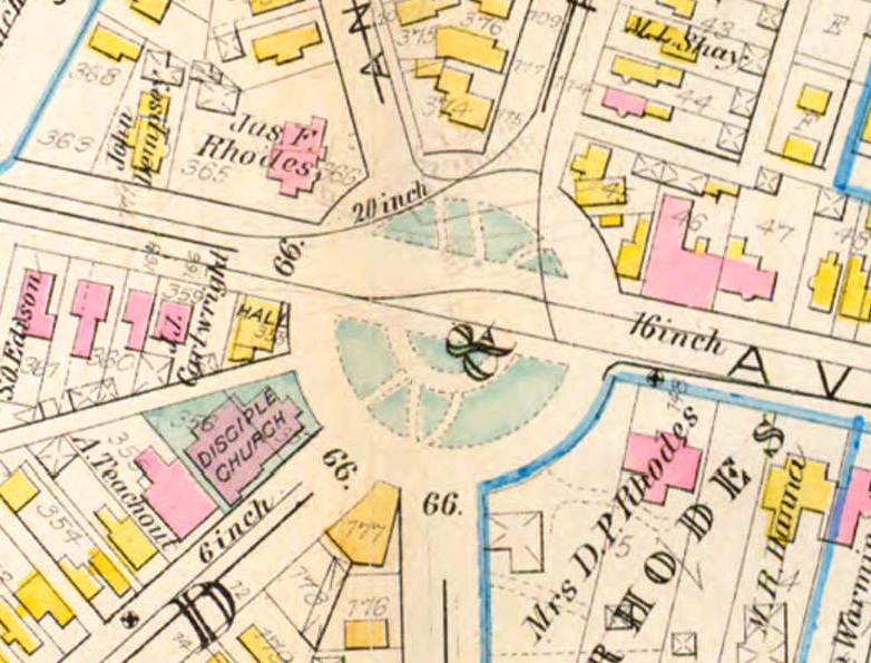 This part of Cleveland's 1881 Atlas map reveals that, in the late nineteenth century, Franklin Circle Christian Church was literally surrounded by mansions-- with most of them owned by Daniel Pomeroy Rhodes family members or their business associates. The Rhodes family, however, did not worship at Franklin Circle Christian Church. They were Episcopalian and worshiped at St. John's Episcopal Church several blocks north of the Circle on Church Street.