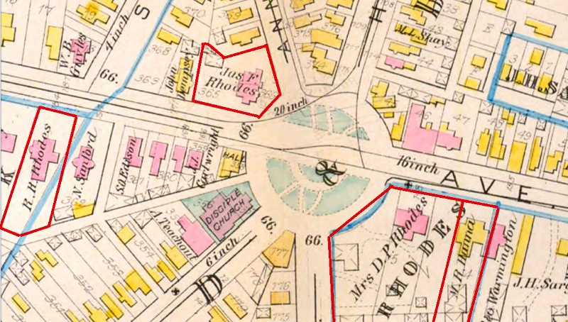 As this part page from the 1881 Cleveland Atlas reveals, in that year the Robert Russell Rhodes mansion (left of photo and outlined in red) and other Rhodes family residences surrounded Franklin Circle. Across the street from Robert Russell Rhodes' home was the home of his brother, noted American historian James Ford Rhodes. On the other side of the circle was the home of his mother Sophia, who was the widow of Daniel Pomeroy Rhodes. Next door to her was her daughter Charlotte Augusta and her famous son-in-law, Marcus Hanna. One door down from the Hanna mansion was the home of George Warmington, a business partner of Daniel Pomeroy Rhodes and later of Robert Russell Rhodes.