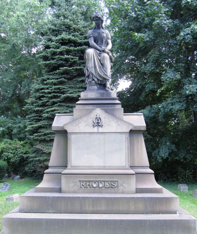 At Riverside Cemetery on the west side of Cleveland, the Rhodes family is remembered with this sculptured granite monument. Robert Russell Rhodes and many members of his family are interred here, including his father Daniel Pomeroy Rhodes, his mother Sophia Russell Rhodes, his brother and noted American historian James Ford Rhodes, his wife Kate Castle Rhodes, and his two children, William Castle Rhodes and Fanny Rhodes Farwell.