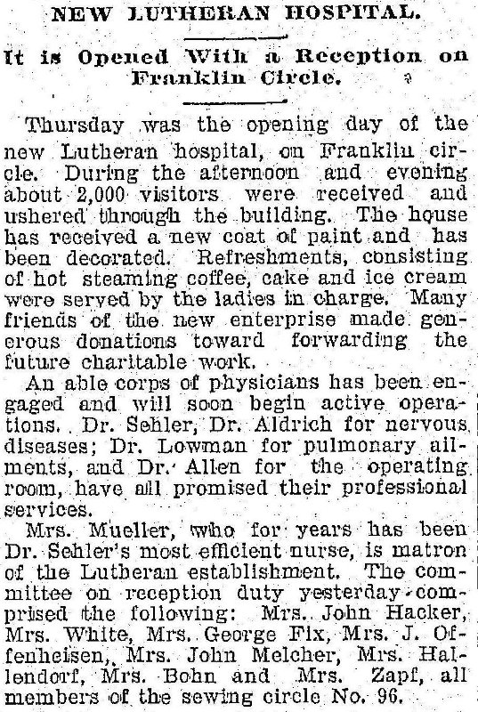 On October 10, 1896, the above article appeared in the Cleveland Plain Dealer, announcing the opening of new Lutheran Hospital on Franklin Circle. | Creator: Cleveland Plain Dealer | Date: October 10, 1896 | Source: Cleveland State University Library, Special CollectionsDownload Original File