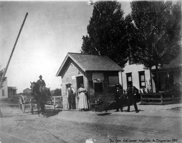 This small gatehouse stood on the northwest corner of Mayfield and Superior roads. This shot, taken 25 years after the toll road opened, suggests the persisting rural setting in what would soon become the suburban village of Cleveland Heights. Note the small sign on the side of the gatehouse. It reads "Binder Twine for sale here." | Source: City of Cleveland HeightsDownload Original File