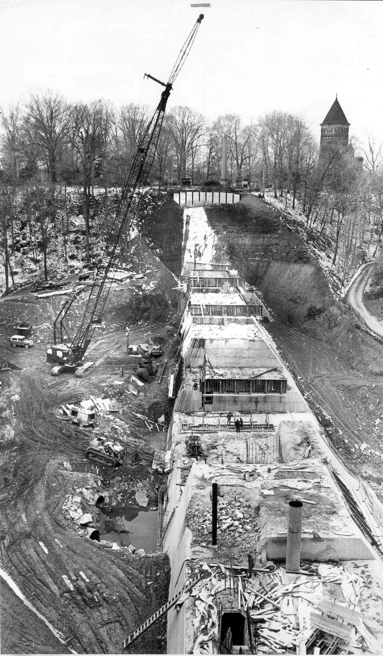 This dam resulted from a lawsuit filed by Lake View Cemetery's board of trustees to suspend further expansion of Cleveland Heights's and University Heights's sewer system out of concern for worsening flooding that accompanied flash flood events. In 1975, a court ordered the Northeast Ohio Regional Sewer District to construct a large dam on Dugway Brook. In this construction view, the Garfield Monument stands in the distance. | Date: 1977 | Source: Cleveland Memory Project, Cleveland State University Library Special CollectionsDownload Original File