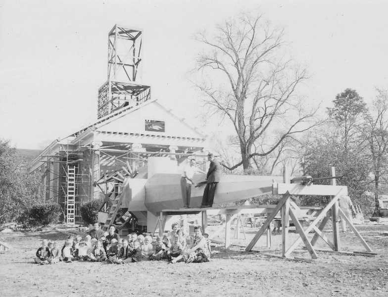 Children in the congregation pose beside a new steeple on the front lawn of Forest Hill Church. Following a storm that knocked down the original church steeple, a restoration project got underway. The resulting steeple was considerably taller and more elaborate than the original it replaced.