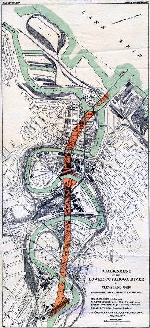 Prospectors proposed several plans to alter the Cuyahoga River, and this 1917 blueprint outlines a drastic plan to straighten the river. The state of the river in 1917 is highlighted in turquoise, and the proposed rerouting is highlighted in orange. Regarded unfeasible, the plan was never approved. Irishtown Bend is located just left of center in the blueprint, along the northwest bank of the bend curving westward. | Date: 1917 | Source: Cleveland State University. Michael Schwartz Library. Special Collections.