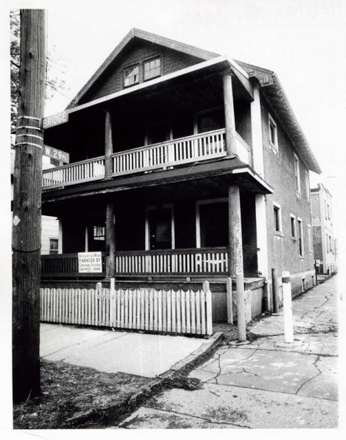 For more than forty years, 2825 Bridge Ave. was designated erroneously by the Ohio Historical Society as the birth site of John Heisman. The house, pictured here in 1978, was built in the 1910s. As early as 1984, the accuracy of the location came into doubt. Plain Dealer reporter Thomas Andrzejewski believed the correct location was actually 4006-8 Bridge Ave. In 2002, local architectural historian Craig Bobby discovered conclusively that the correct location was 3928 Bridge Ave. The homes were renumbered in 1906, a change that produced the original error that landed the marker in the wrong place. | Date: 1978 | Source: Cleveland Press Collection, Michael Schwartz Library Special Collections at Cleveland State UniversityDownload Original File