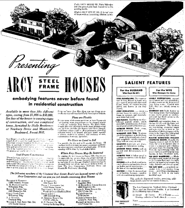 This advertisement touts Arcy's unique construction method, which combined structural steel and sheet steel covered by cork insulation and faced with brick or stone. Arcy Corporation, based in New York, built five homes in the $15,000 range in Forest Hill. One of them, at Monticello and Newbury Drive, was furnished by Halle Bros. department store as a demonstration. Its plans to build many more such houses fell through amid Depression woes.
