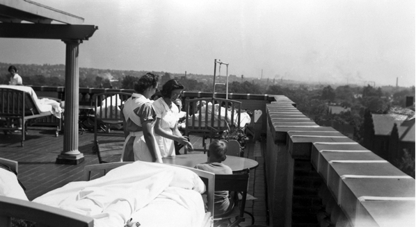 Clinic Rooftop, 1940s ID: 54 | This file appears in: Cleveland Clinic Cleveland Clinic Rooftop Facing East, ca. 1940s. At this time, the sunny rooftop at the Clinic was often used to treat returning veterans who had been injured during World War II. | Source: Cleveland Clinic Foundation Download Original File SourceCleveland Clinic Foundation "Clinic Rooftop, 1940s" appears in: Cleveland Clinic