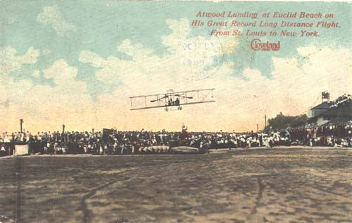 Harry Atwood lands his plane on Euclid Beach in August 1911. The Euclid Beach bathhouse can be seen in the background. Atwood flew 1,265 miles on his journey, making eleven stops along the way. His actual time in the air was 28 hours and 31 minutes, giving him an average speed of 44 MPH. | Date: August, 1911 | Source: Image Courtesy of Cleveland State University. Michael Schwartz Library. Division of Special Collections. Cleveland Press Collection.Download Original File