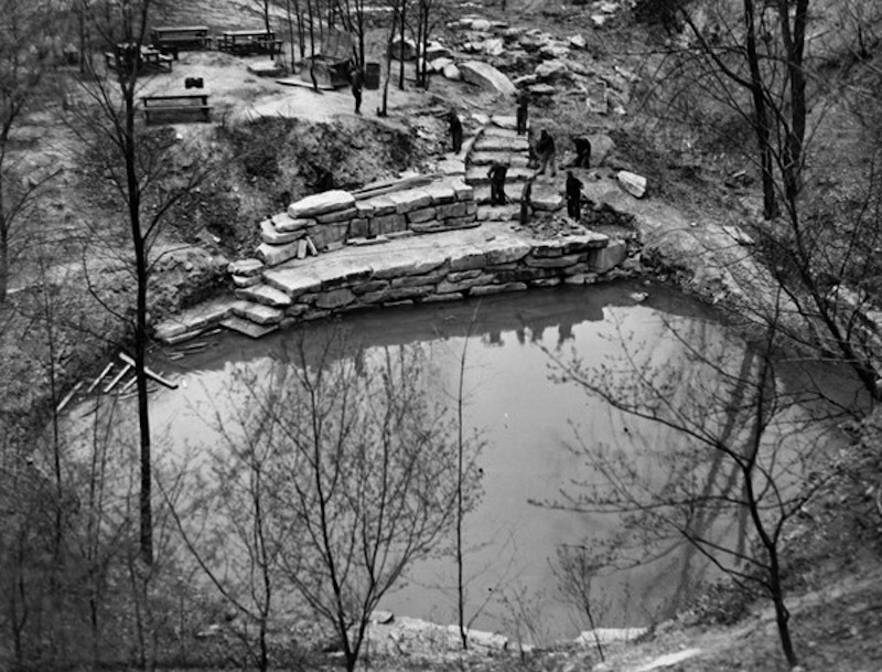Quarry Wall, 1938 ID: 5509 | This file appears in: Bluestone Quarries Pictured is the Civilian Conservation Corp building a stone wall around a deserted bluestone quarry. Similar projects to guard or fill in abandoned quarries were undertaken as part of the Works Progress Administration throughout the United States. Image courtesy of Cleveland State University Special Collections Download Original File "Quarry Wall, 1938" appears in: Bluestone Quarries