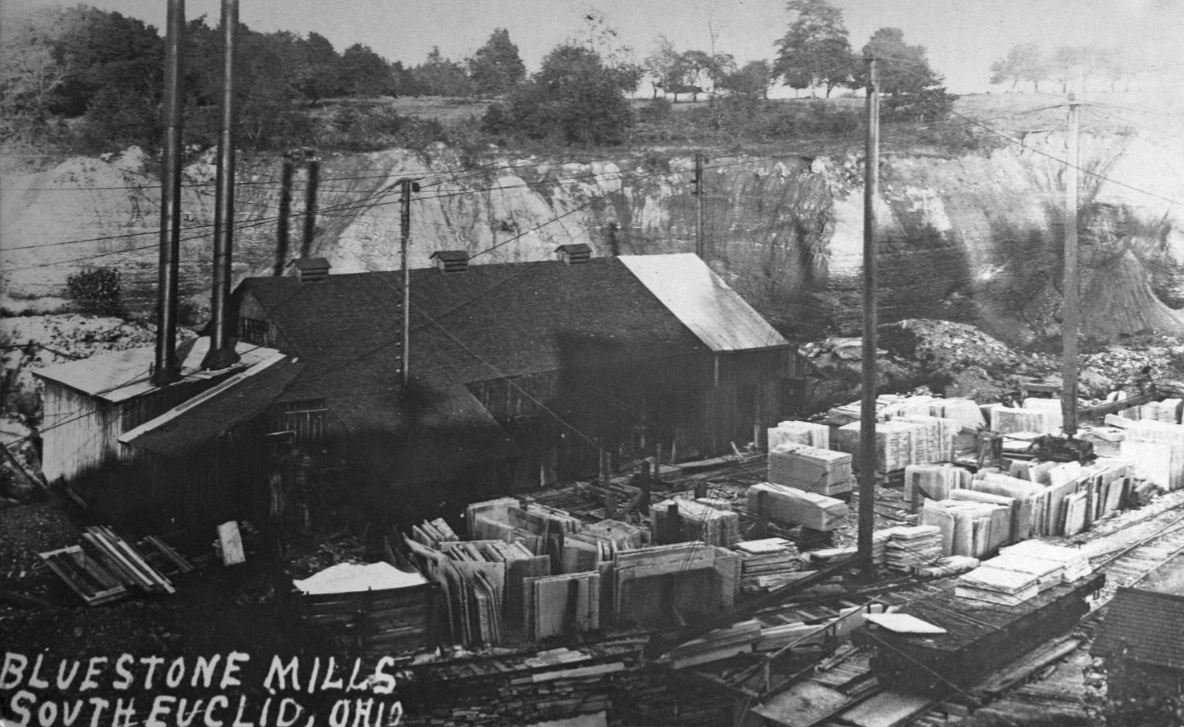 Bluestone Mill ID: 5513 | This file appears in: Bluestone Quarries The construction of water and steam powered mills during the 1800's allowed for more efficient production of large slabs of the fine grained sandstone; these sheets of bluestone were extensively used in the Cleveland area for sidewalks. Image courtesy of South Euclid Historical Society Download Original File "Bluestone Mill" appears in: Bluestone Quarries