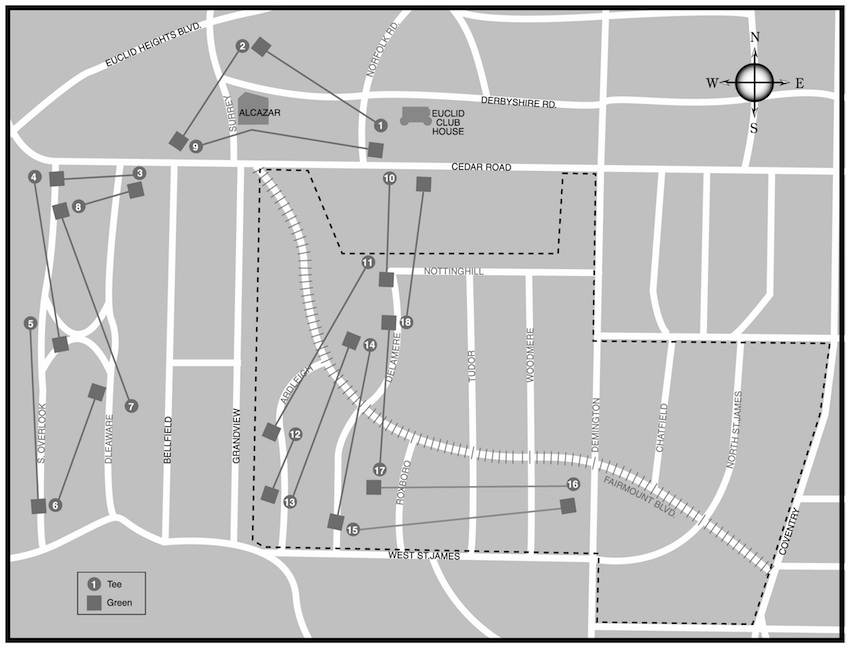 A map of the Euclid Club grounds appeared in the Plain Dealer when the club opened. A current street map is superimposed to show the approximate location of the 18 holes. Golfers teed off at the club house, crossed Cedar, and returned to the clubhouse to finish nine. The tenth through eighteenth holes were across Cedar on the grounds that would be come the Euclid Golf Allotment. Thanks to William Barrow for sourcing the original links layout.