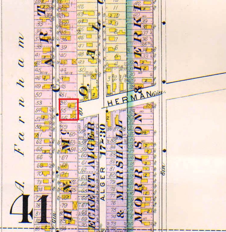This partial page from the 1898 Cleveland Atlas depicts houses and other structures located in the McCart Street-Herman Avenue area in that year. Outlined in red are parts of two lots owned by James Faeron, the person authorized in 1894 to move the West Cleveland Town Hall. The building with the number "2" (denoting a two-story dwelling) is believed to be the West Cleveland Town Hall. Approximately 15 years later, when the City of Cleveland extended Herman Avenue through to West 69th Street (formerly McCart Street), the town hall building is believed to have been moved again by Faeron to its current location on the north side of Herman just east of West 69th Street.