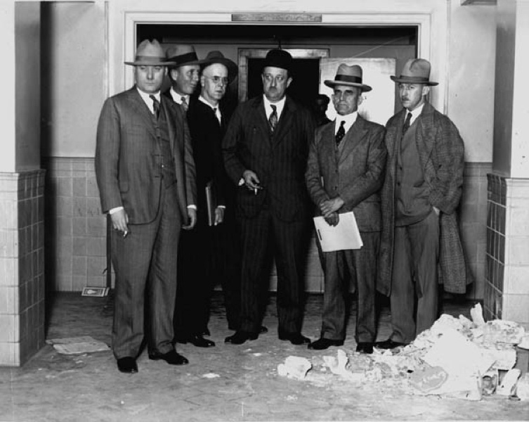 These representatives from the Ohio Inspection Bureau were among those charged with investigating the cause of the X-ray fire that occurred in the film storage room in the subbasement of the Cleveland Clinic. The investigating team came up with three viable theories as to the cause of the fire, which were detailed in the report sent to the National Board of Fire Underwriters. | Source: Cleveland Memory Project, Cleveland State University Library Special CollectionsDownload Original File