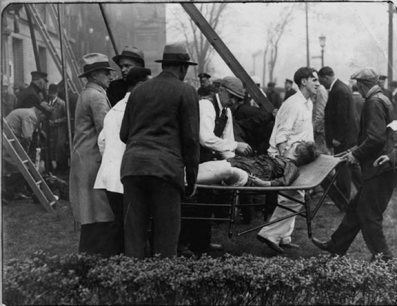 Many that arrived to watch the rescue effort take place pitched in to help administer aid. Bodies of the first victims of this tragic X-ray fire turned yellow shortly after being brought out of the hospital, and later turned green. This was said to be symptomatic of death from inhalation of nitrogen peroxide. | Source: Cleveland Memory Project, Cleveland State University Library Special CollectionsDownload Original File