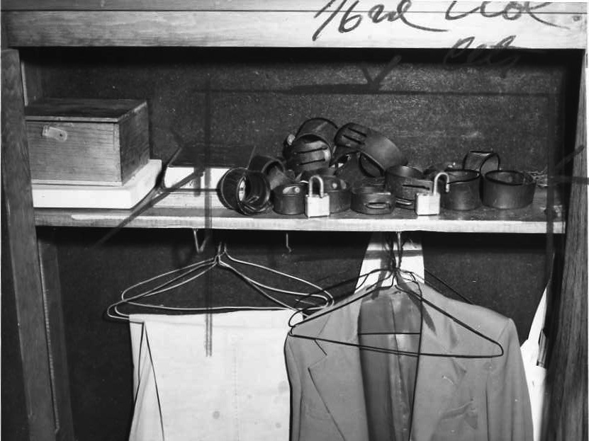 Taken on October 18, 1955 in part for Al Ostrow's investigation of Cleveland State Hospital, this photo shows a storage closet in the aides' room where shackles were held for patients that were uncooperative. | Date: 1955 | Source: Cleveland State University. Michael Schwartz Library. Special Collections.Download Original File