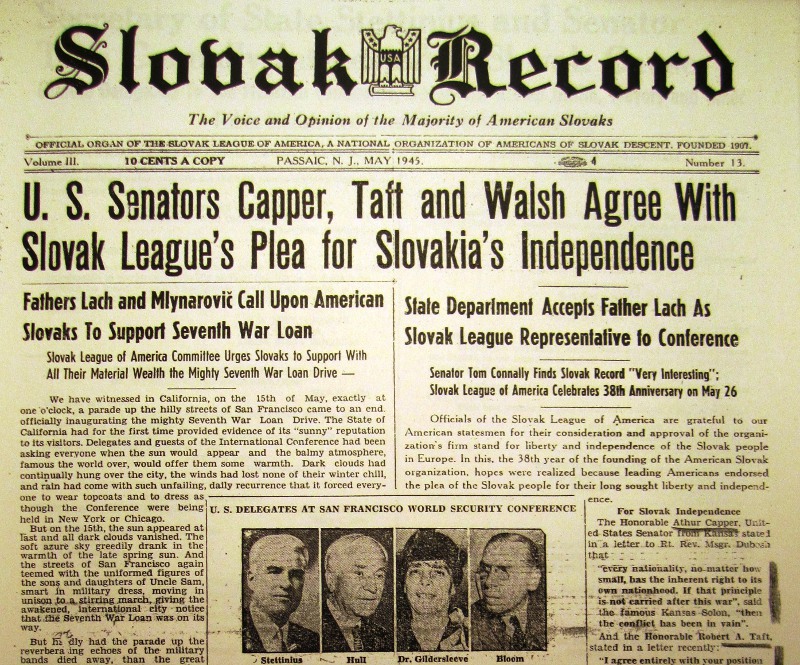 In the three years during World War II that Monsignor Dubosh served as President of the Slovak League of America, the organization published the "Slovak Record," an ethnic newspaper containing articles in both the English and Slovak languages. Many of the articles detailed acts of patriotism and sacrifice that American-Slovaks were making to promote a successful conclusion to the war effort. Other articles recounted the history of the Slovak people and called upon the United States government to support an independent democratic state in Slovakia. The above photo is from the newspaper's May 1945 edition.