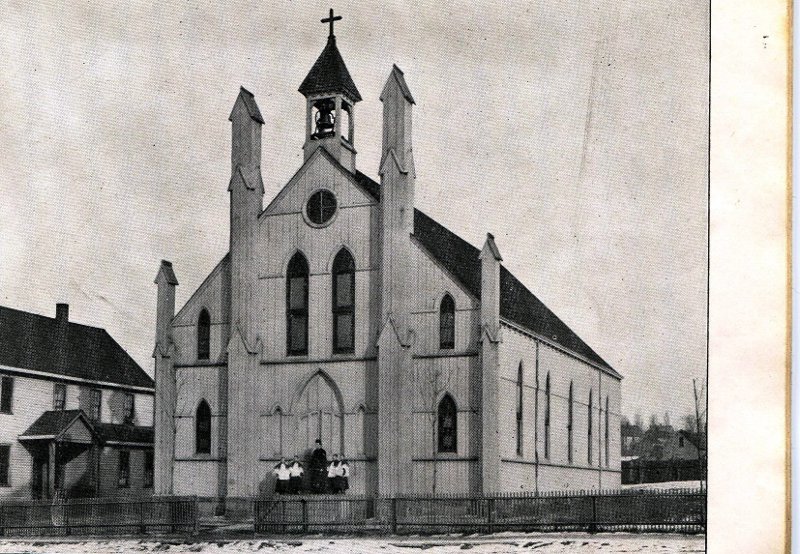Undated photograph of the original St. Ladislas Roman Catholic church that stood on the northeast corner of Holton and Corwin (East 92nd) Avenues, facing Corwin Avenue. The church was built in 1889 and was used by the parish until it was moved in 1906 to make way for a new and larger brick church. The riot between Magyar and Slovak parishioners on August 2, 1891 took place in this church. | Source: Slovak InstituteDownload Original File